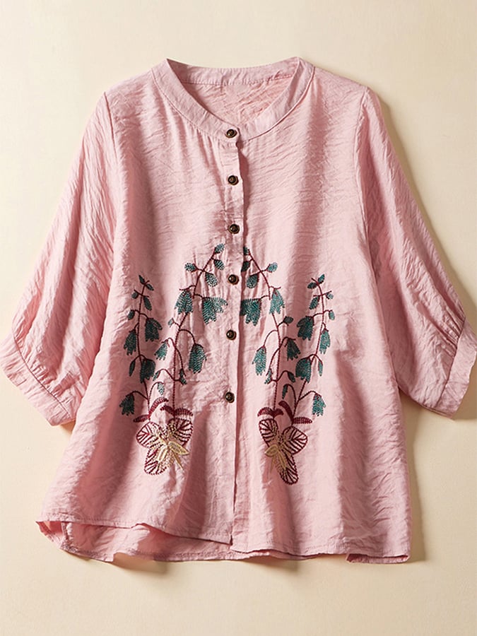 Fashion Embroidered Lapel Loose Cotton Linen Shirt