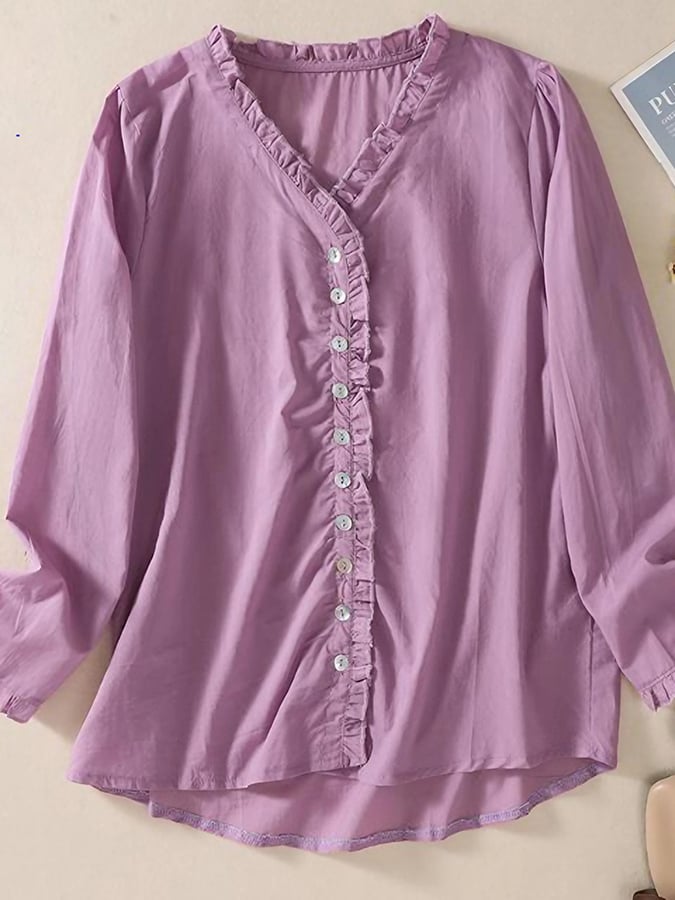 Cotton And Linen Side Of Fungus Long Sleeved V-neck Shirt