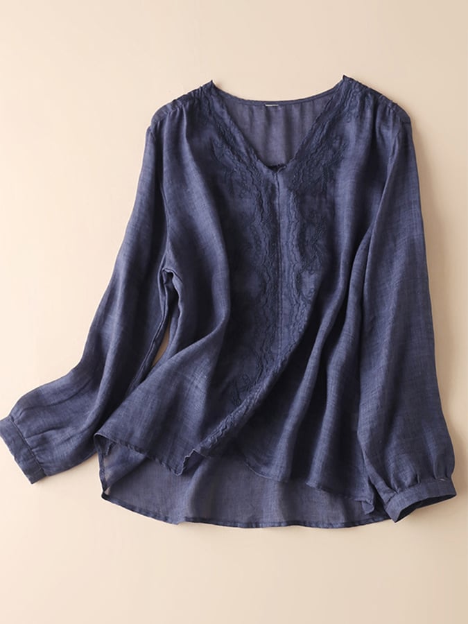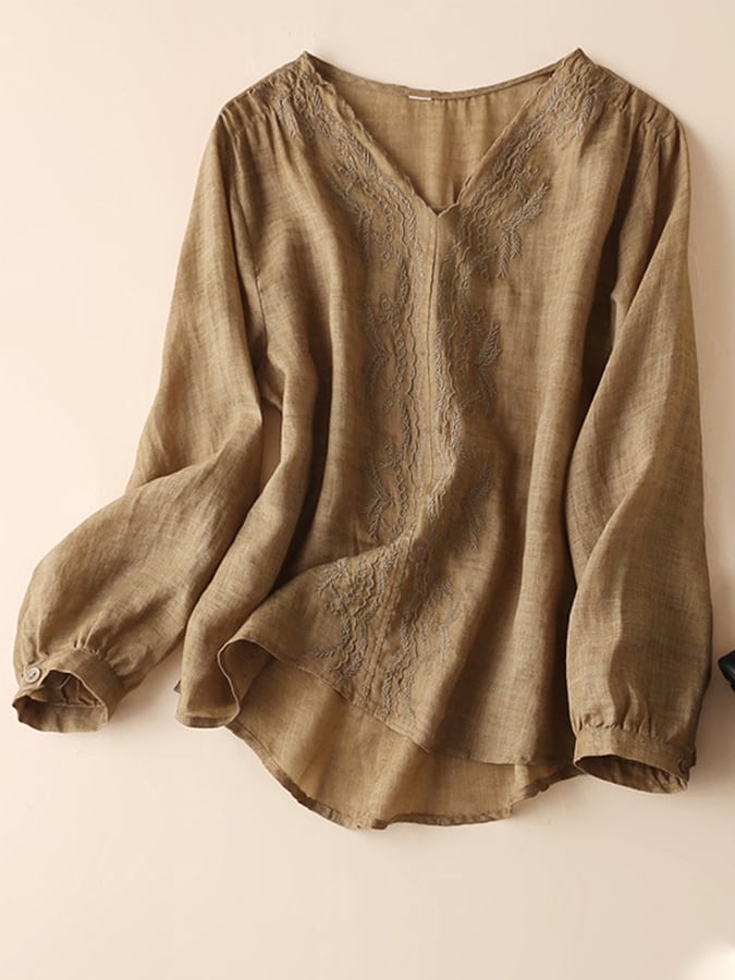 Cotton And Linen Loose V-neck Embroidered Long Sleeve Shirt