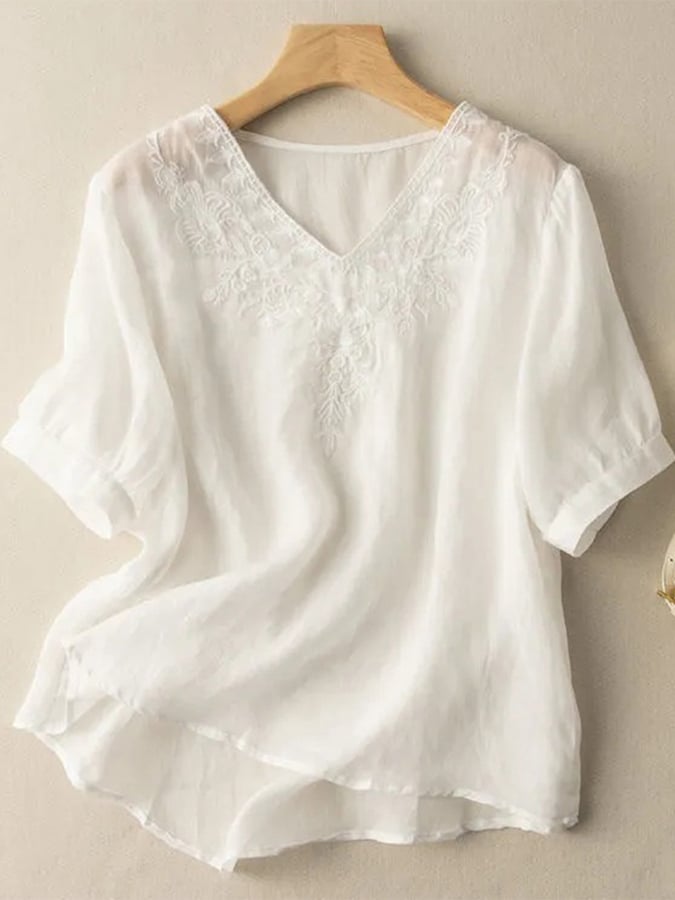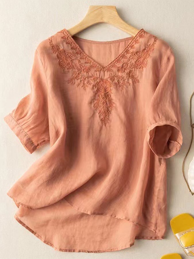 Cotton And Linen V-neck Embroidered Loose Shirt