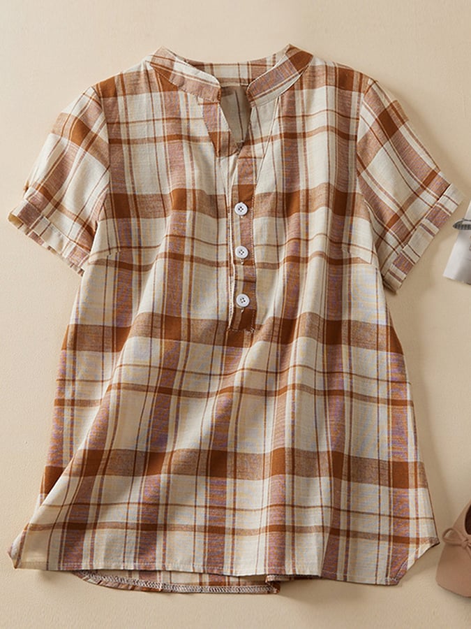 Cotton And Linen V-neck Plaid Loose Shirt